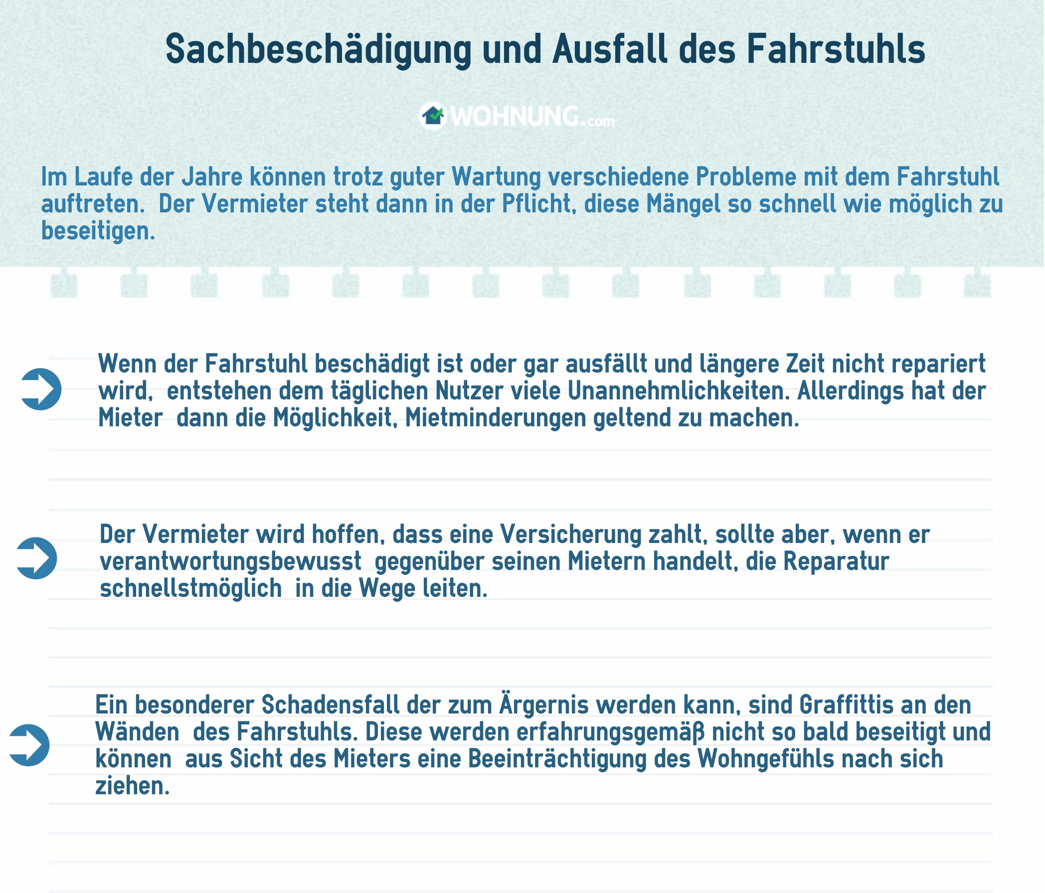 Mit der Verantwortung als Vermieter sind bekannterweise zahlreiche Pflichten verbunden. Wenn er dem Angebot des Fahrstuhls durch Ausfall nicht nachkommen kann, sind Mietminderungen erwartbar, da die Fahrstuhlkosten vom Mieter mitgetragen werden.