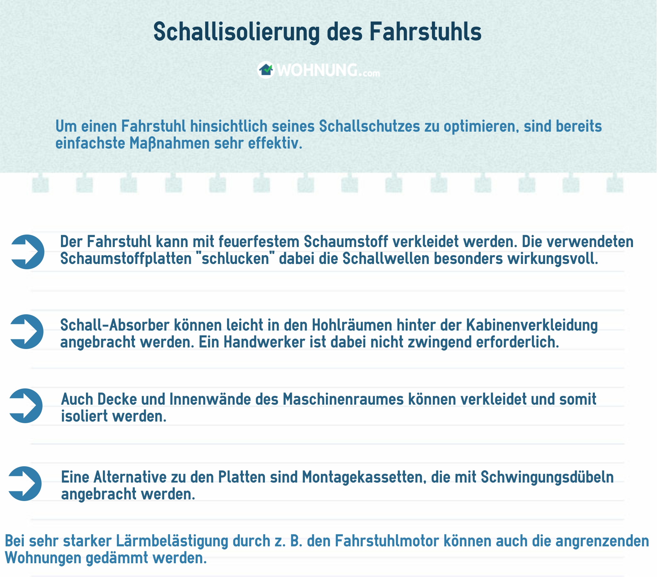 Deshalb empfiehlt es sich, bei Neubauten Aufzugsschacht und Maschinenraum so anzulegen, dass sie sich direkt neben Küche, Badezimmer und Abstellkammer befinden – Räume, in denen sich der Mieter nicht so häufig aufhält. Überlaute Fahrstühle und Aufzugsschächte sollten den modernen Schallschutz Richtlinien angepasst und ausreichend gedämmt werden, um eine Lärmbelästigung der Mieter zu vermeiden.