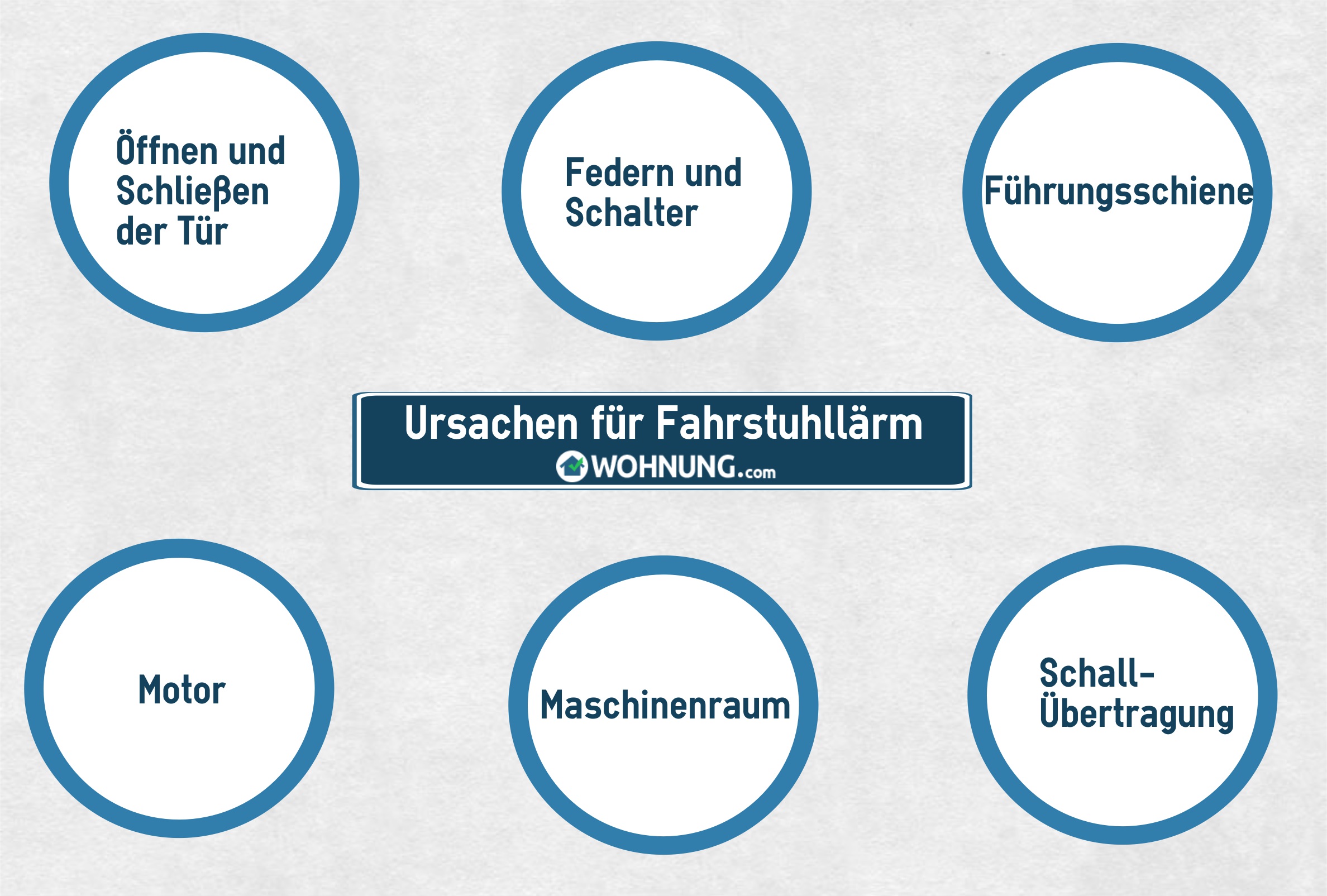 Auch wenn die für das menschliche Ohr unangenehmen Geräusche meist bei Fahrstühlen älterer Baujahre auftreten, muss der Fahrstuhl Nutzer nicht gleich befürchten, dass die Aufzugs-Kabine abstürzt: Viele Fahrstühle haben zwar konstruktive Mängel, sind aber dennoch betriebssicher. Die Störgeräusche sind in der Kabine selbst, im Fahrstuhlschacht und in den angrenzenden Wohnräumen zu hören.