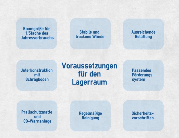 Sicherheit: Der Lagerraum benötigt eine spezielle Tür, mindestens von der Qualität T30. Weitere Anforderungen klärt die jeweilige Brandschutzverordnung des Bundeslandes. Da Pellets nach einer Zeit Kohlenmonoxid bilden können, sollte der Lagerraum niemals allein betreten werden. Vor dem Öffnen ist eine ausreichende Lüftung nötig. Zudem kann in verschlossenen Räumen mit einer großen Pelletmenge ein explosives Staub-Gas-Gemisch entstehen, auch für diese Situation ist eine funktionierende Lüftung unerlässlich. Um eine bessere Kontrolle über die Kohlenmonoxid-Entwicklung zu haben, empfiehlt sich die Installation einer CO-Warnanlage.