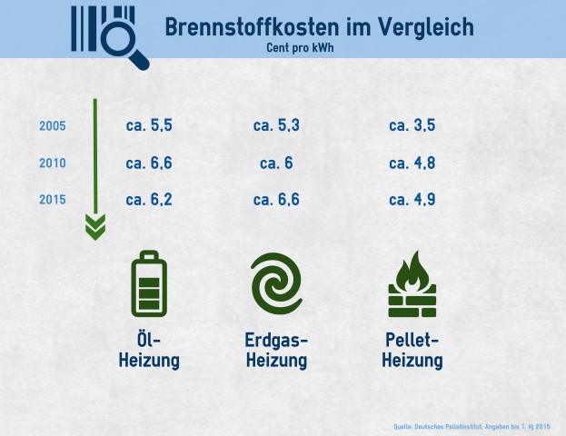 Im Jahr 2015 lag der Pellet-Preis bei 240,16 € pro Tonne, das sind rund 47 Euro pro Megawattstunde (MWh). Zum Vergleich, eine MWh aus Heizöl lag bei rund 60 Euro, aus Erdgas bei rund 70 Euro. Am günstigsten ist lose Ware, beispielsweise für einen Erdtank oder einen Lagerraum. Kilosäcke oder Bigpacks sind dazu im Vergleich etwas teurer, benötigen jedoch keinen extra Lagerraum.