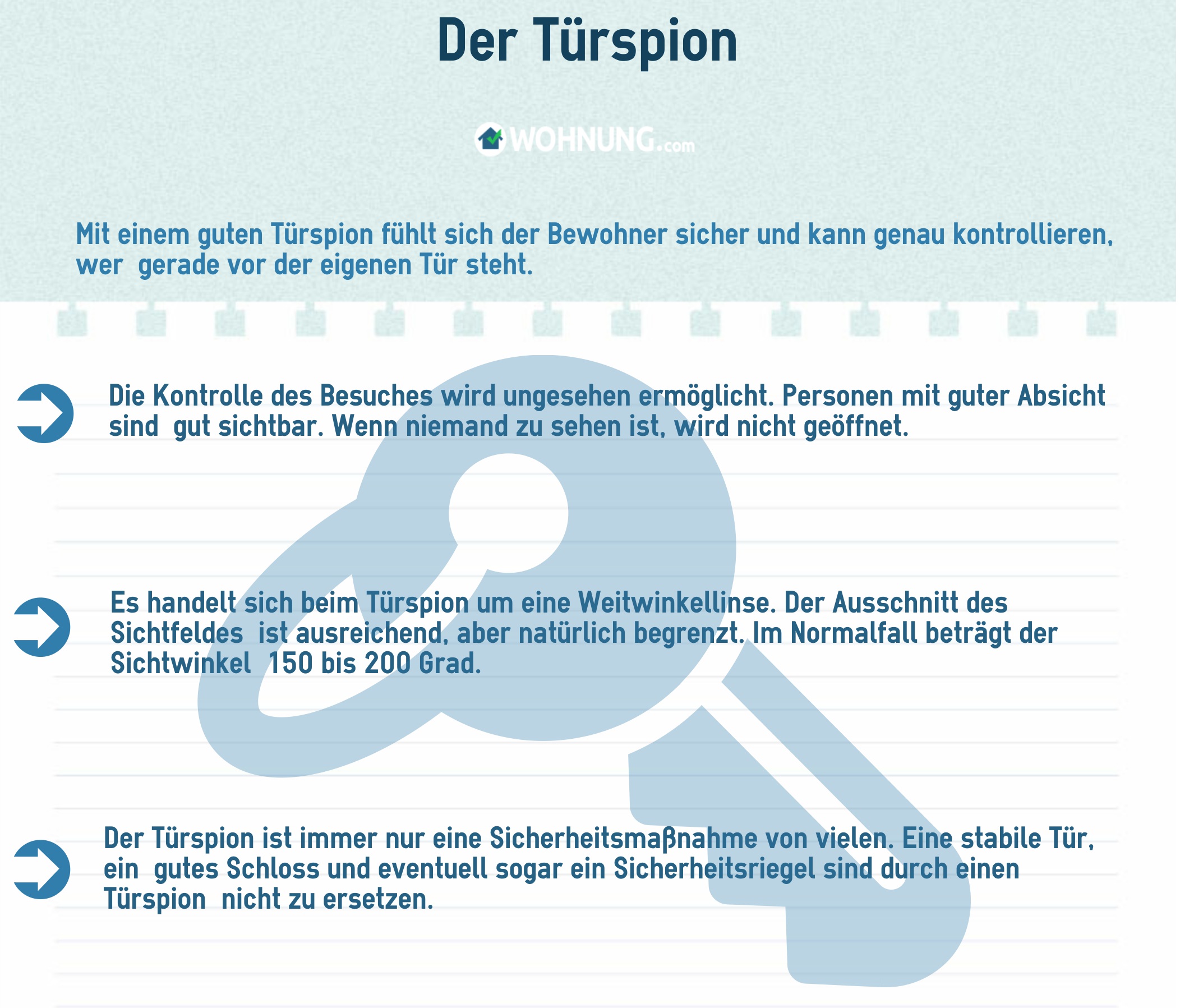Der erspäht lautlos und ungesehen die Situation vor seiner Wohnungstür. Der Türspion befindet sich als eine Weitwinkellinse zentriert in der Eingangstür in Augenhöhe des Bewohners. Der Sichtwinkel ist horizontal und vertikal begrenzt, sodass die Devise gelten sollte: Wenn niemand zu sehen ist, dann wird die Tür ohnehin nicht geöffnet.