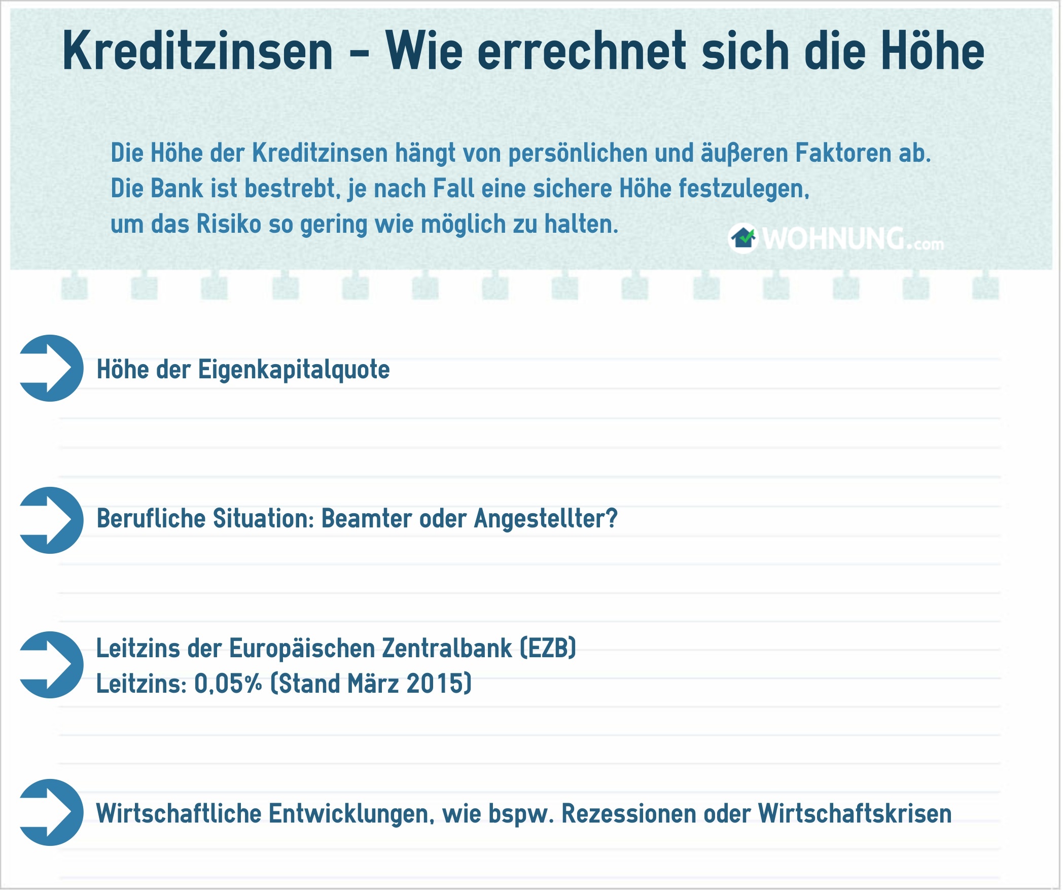 Sehr viel wichtiger als diese persönlichen Faktoren ist für die Bank jedoch der aktuelle Leitzins der Europäischen Zentralbank. Durch diesen wird festgelegt, wie viel Zinsen die Banken bezahlen müssen, wenn sie sich Geld bei der Zentralbank leihen. Der Leitzins bewegt sich seit 2009 auf einem Tiefstand und hat im Lauf des Jahres 2014 fast die Nulllinie erreicht.